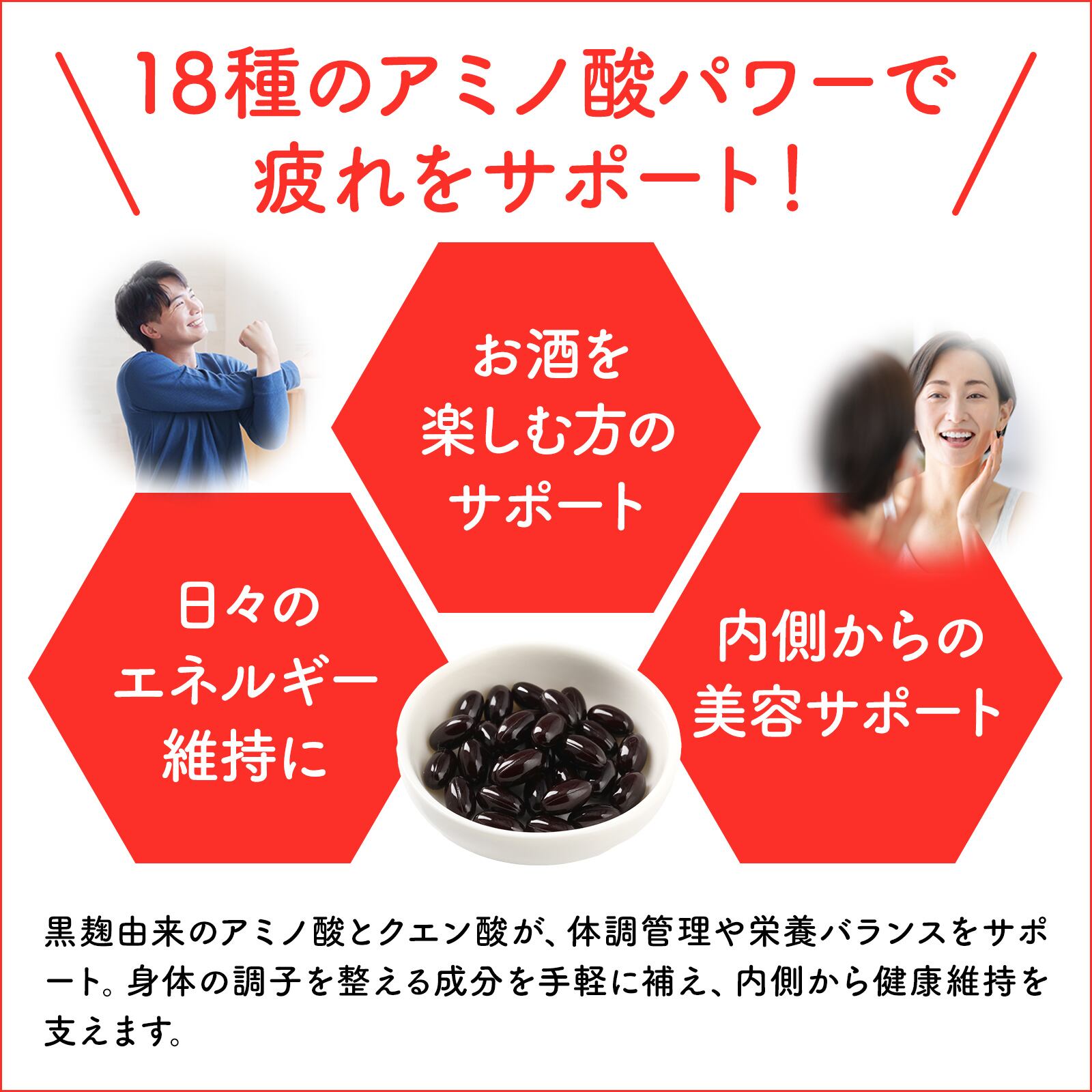 麹菌の中でもトップクラスの発酵力を持つ黒麹。その力で生まれる18種類のアミノ酸と天然クエン酸が、あなたの毎日を元気に、美しく支えます。