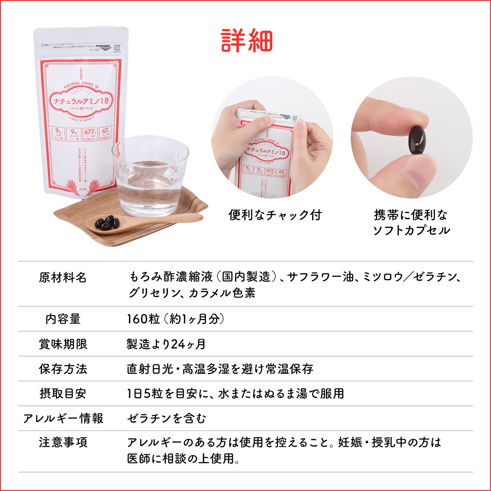 • 原材料名:もろみ酢濃縮液(国内製造)、サフラワー油、ミツロウ/ゼラチン、グリセリン、カラメル色素