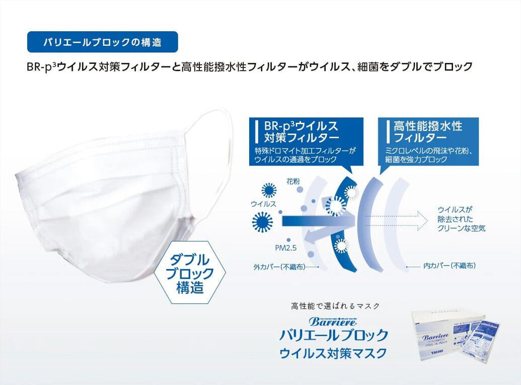 花粉、ほこり、細菌、PM2.5、ウイルス飛沫をBR-p3 ウイルス対策フィルターと高性能撥水性フィルターがダブルブロック。菌や飛沫の侵入を阻止します。