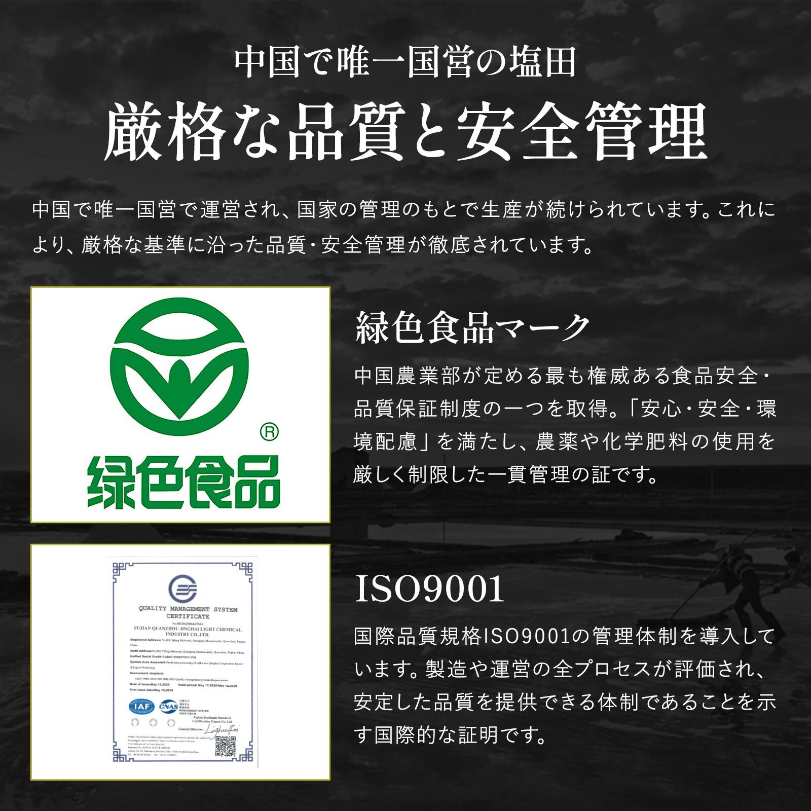 「命源の塩」の塩田は、中国で唯一国営で運営され、国家の管理のもとで生産が続けられています。これにより、厳格な基準に沿った品質・安全管理が徹底されています。